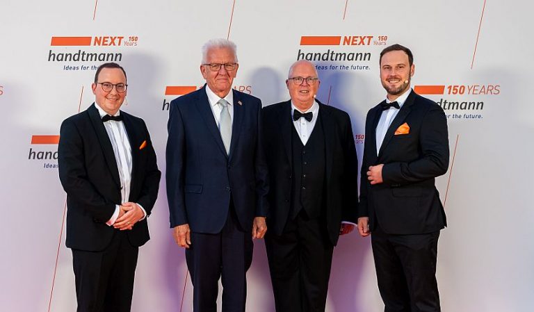 Minister-President Winfried Kretschmann (2nd from the left) thanked Thomas Handtmann (3rd from the left), company director of many years and now President of the Advisory Board. The Minister-President wished the fifth generation of the family and the new management with Markus Handtmann (on the left) and Valentin Ulrich (on the right) much success and always the right touch in all their undertakings (photo: Handtmann)