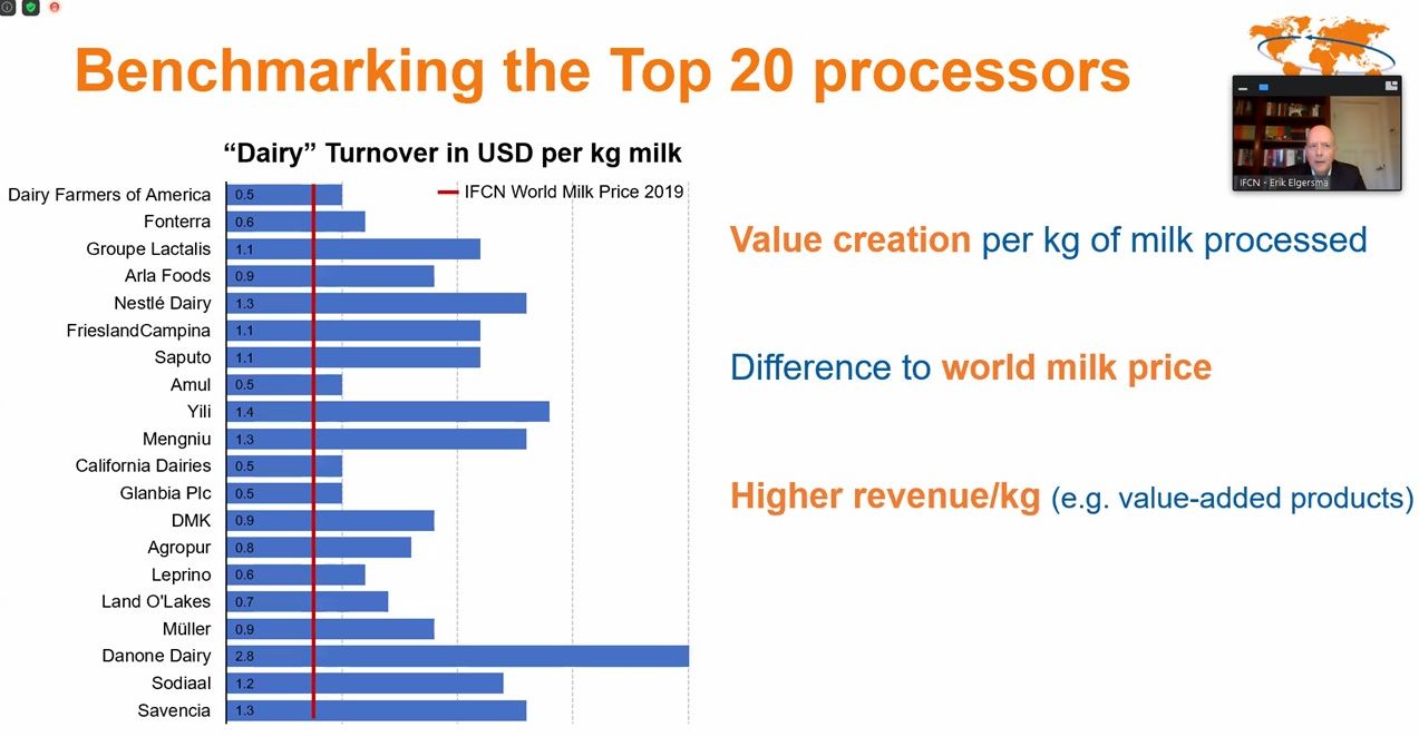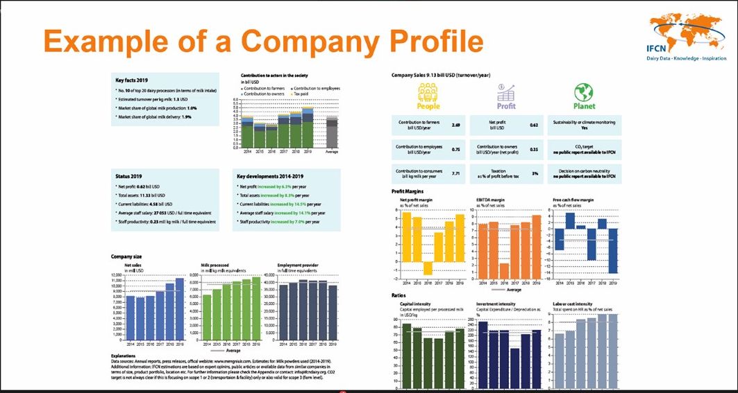 In a web conference for almost 490 participants from around the world, IFCN today presented details of the new report. Each company is portrayed on two pages, with the data being evaluated to make it meaningful. Ten Key Performance Indicators (labour productivity, wage development, capital employed per kg of milk, free cash flow margin, tax rates paid, etc.) allow a more accurate assessment of the company’s performance, but also allow benchmarking of one’s own company against the big players in the industry. With a value creation of 0.8 $/kg milk, cooperatives perform worse than private companies and multinationals (1.1 $/kg) in the group under consideration. This is not directly comparable, however, according to Elgersma, as the business models are quite different and the product mix also varies. As IFCN did not receive all data directly from the companies, they had to estimate some of the data. The authors of the study are certain, however, that these are not too far away from reality.