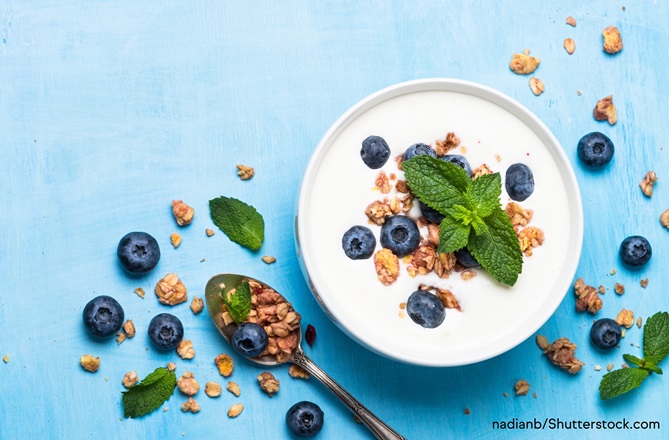 Greek yogurt granola and blueberries on blue table. Top view copy space. Healthy food, snack or breakfast.