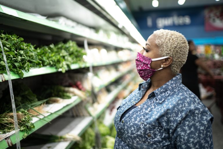 Woman with face mask shopping at supermarket