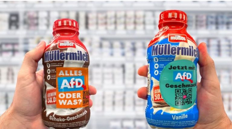 German (ultraleft-wing) campaign organisation Campact e.V. advocates “progressive” politics and wants to defend “democracy”. As part of this motivation, products from the Theo Müller Group are now to be labelled in supermarkets in order to highlight Theo Müller’s alleged proximity to AfD, Germany’s right wing party. Interested parties can order stickers directly from Campact. The organisation claims that, under German law, it is perfectly legal to label products in shops as long as they are not destroyed.
