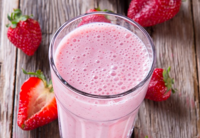 Image: Fresh milk, strawberry drink on wooden table, assorted protein cocktail with fresh fruits.